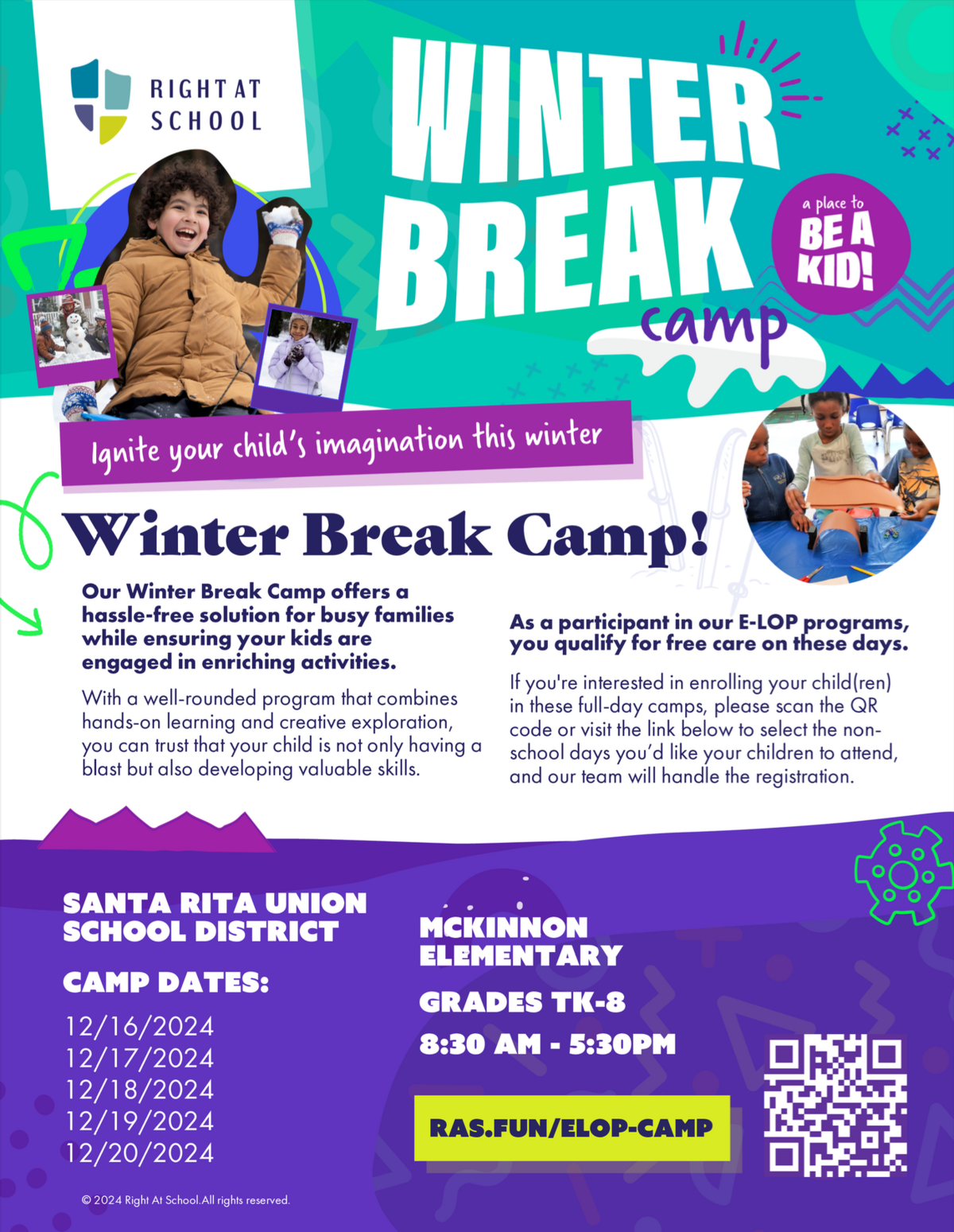 Whether you need a place for your kiddos while you’re at work or you’re looking to take care of holiday to-dos, we’re here to help! Registration is now open for our all-day program designed for kids (TK - 8th Grade) during the upcoming winter break, on 12/16/2024 - 12/ 20/2024 at McKinnon Elementary School from 8:30 am - 5:30 pm.